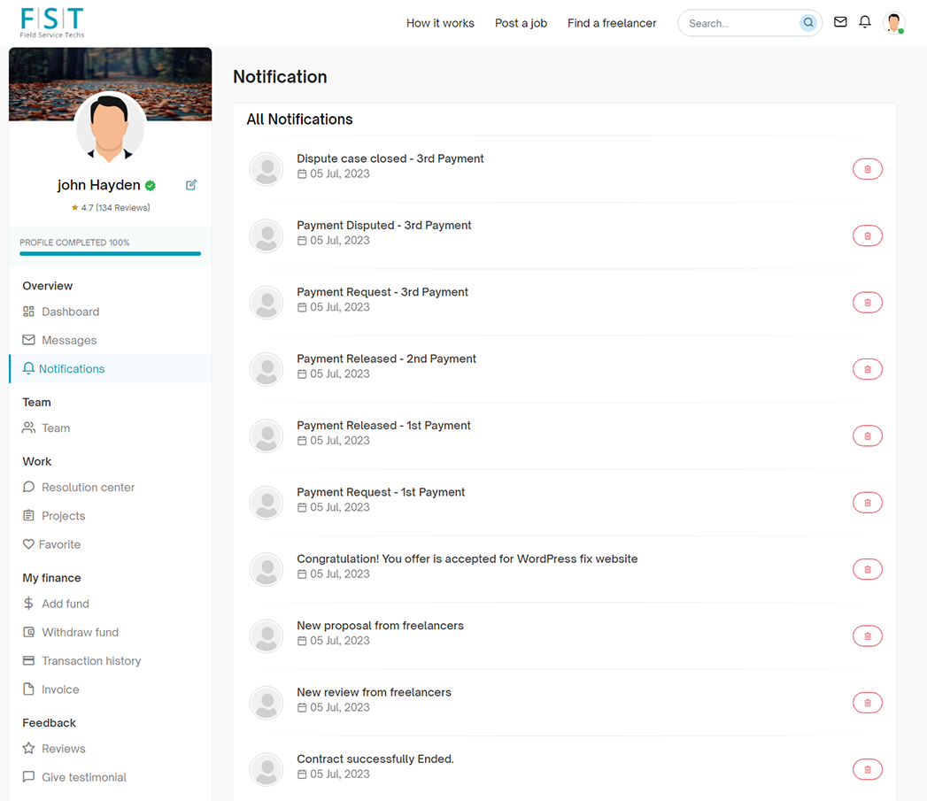 If you have a notification alert, you can easily trace on the notification icon, even without opening it. By clicking on it, you can check all the notifications you have received on FST , including payment request, dispute-related cases, ratings, reviews, and more.