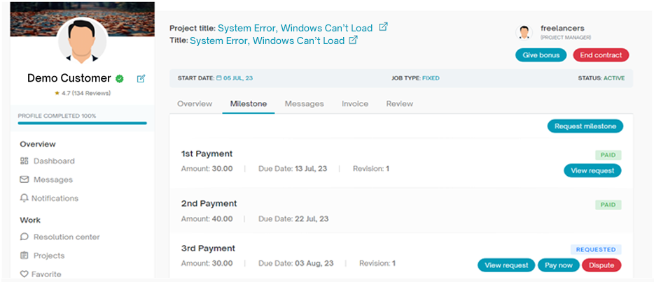 - For each Milestone Payment, you can VIEW REQUEST, clear the payment by PAY NOW option, or DISPUTE it.