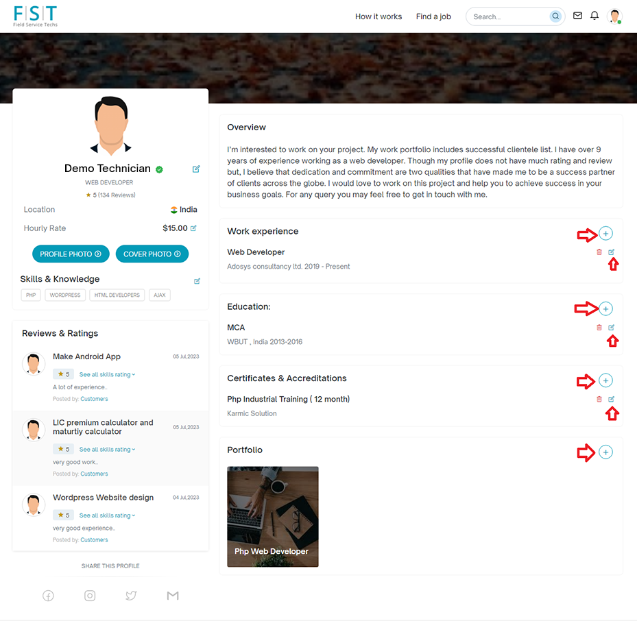 Before biding on the available jobs, you need to build your profile as an Technician.