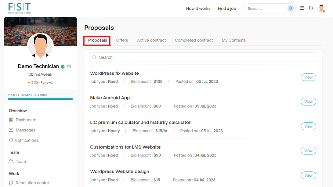 Just below your profile details in the left corner, you can locate an option called ‘Projects’. When you click on it, you can find multiple options, including Proposals, Offers, Active Contract, Completed Contract, etc.