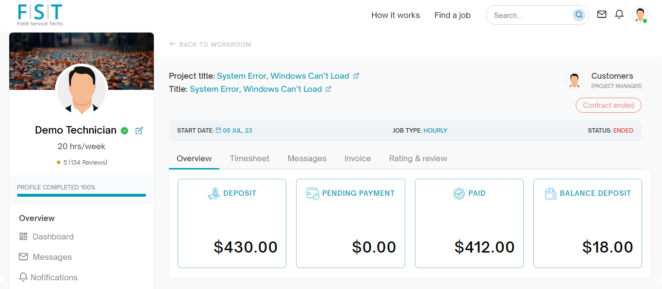 Once you accept the offer, a virtual workroom will be created. On the workroom, you can find an option called ‘OVERVIEW’ where you keep track of the project payment-related information at a glance.